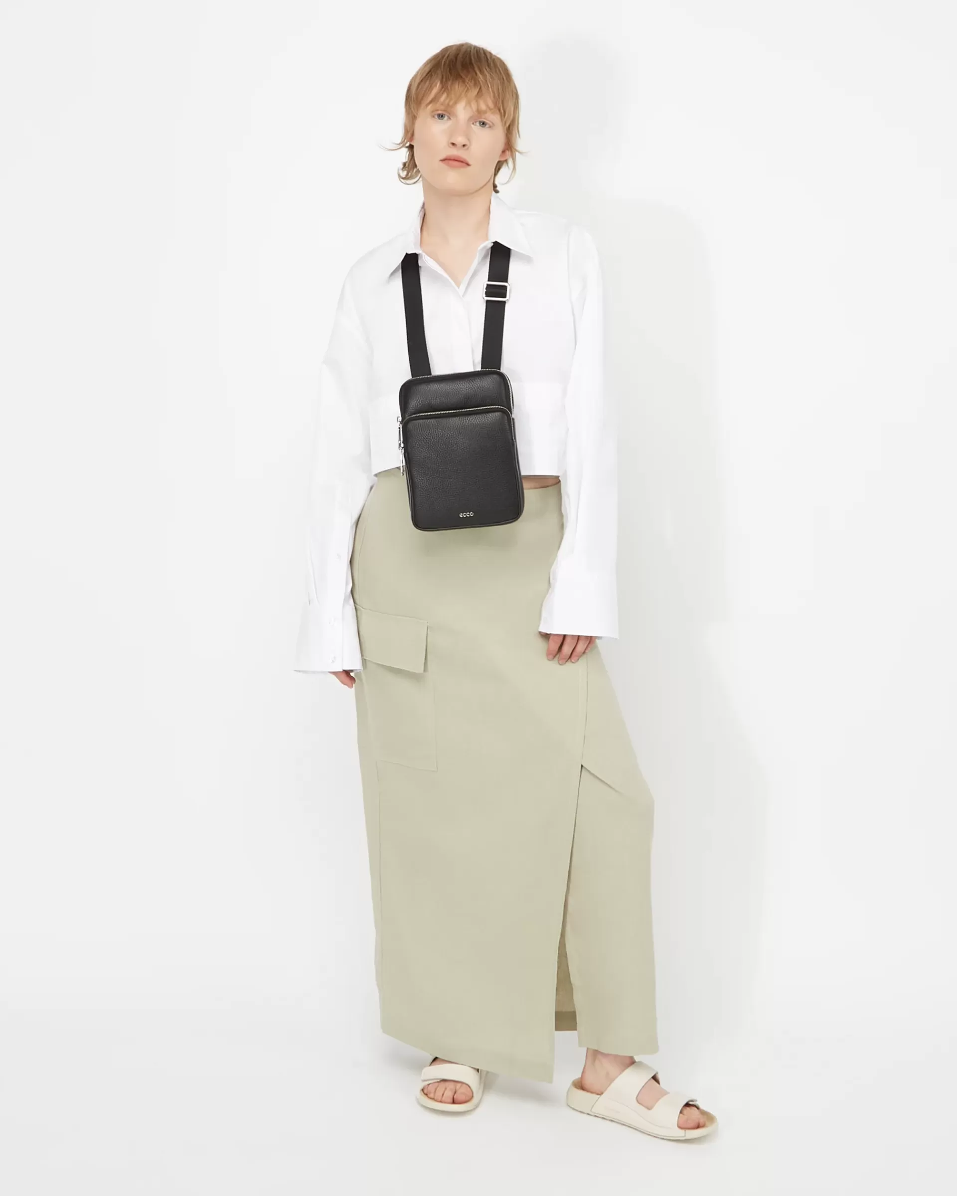 Muotoilultaan pitkä ja kulmikas ECCO Flat Pouch Pebbled Leather on riittävän monipuolinen niin päivä- kuin iltakäyttöönkin. Tässä käytännöllisessä laukussa on sisäinen korttitasku sekä puhelinta tai avaimia varten vetoketjulla suljettava etulokero, johon pääsee helposti käsiksi. Isompaan lokeroon mahtuu esimerkiksi kannettava tietokone ja vesipullo. Nauhakudoksesta tehdyn, säädettävän olkahihnan ansiosta laukku kulkee mukavasti olalla.